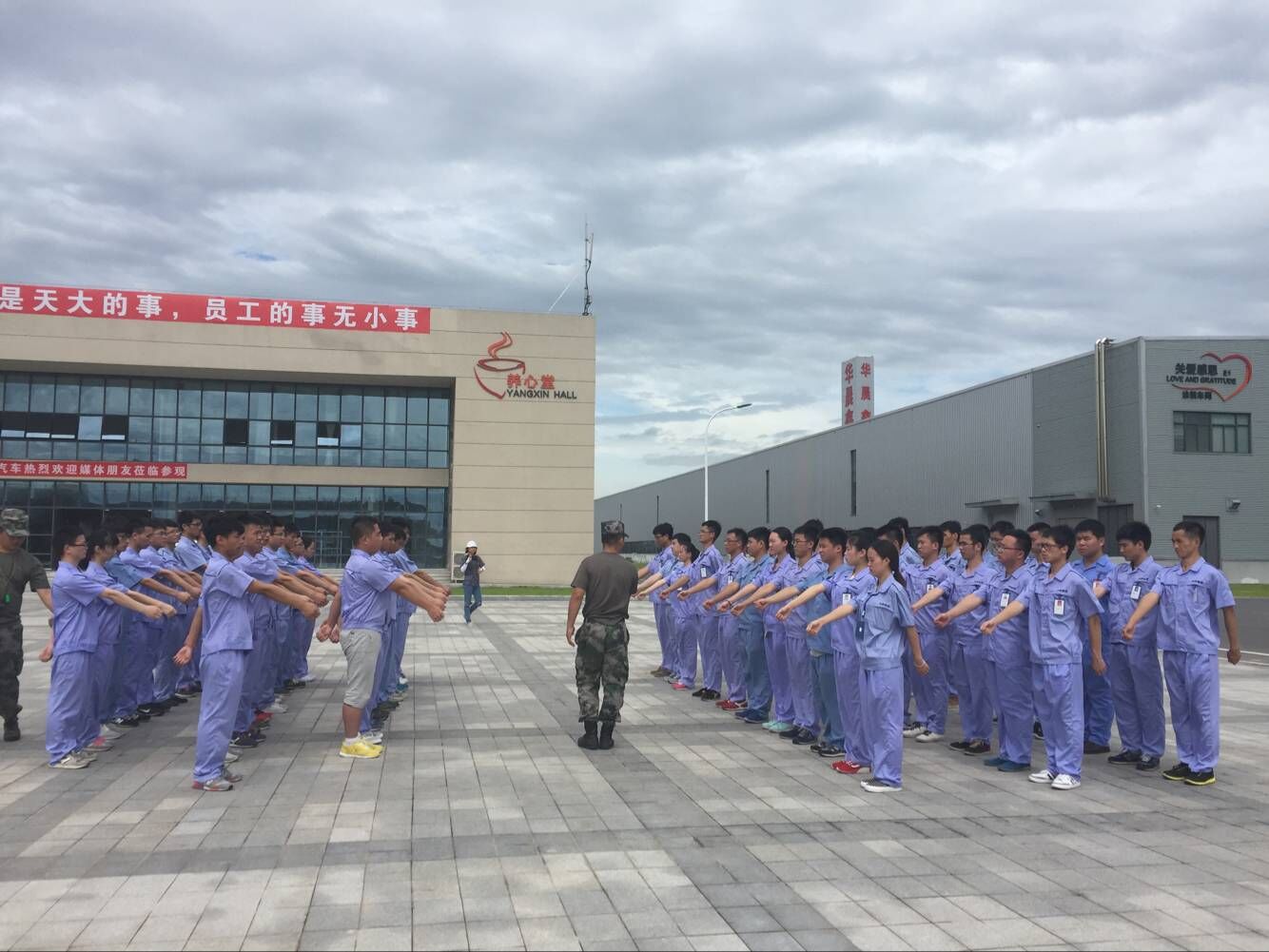 開訓儀式結束后,由訓練教官帶領四個連隊進行專業的團隊建設及軍事訓練。在第一天的訓練中每一位新同事高昂的士氣,讓我們看到鑫源未來的希望。