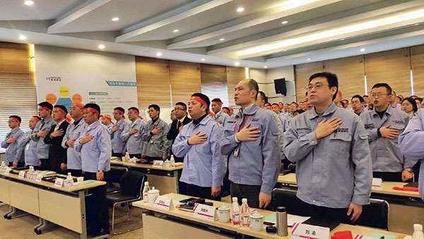接下來,在振奮人心的背景音樂下,董事長與集團公司代表簽訂軍令狀、集團公司與各子公司簽訂軍令狀。這一份份軍令狀,意味著時不我待的緊迫感、起步開局的責任感和舍我其誰的使命感。這一份份軍令狀的背后,體現了“對現狀的一切都不滿意”、“立大志向,立高目標,挑戰自我”、“說話算話,承諾了就要兌現”的精神內涵。每一個團隊都鄭重地簽下了一份份承諾,并在宣誓環節莊嚴地宣誓出2020年的目標。