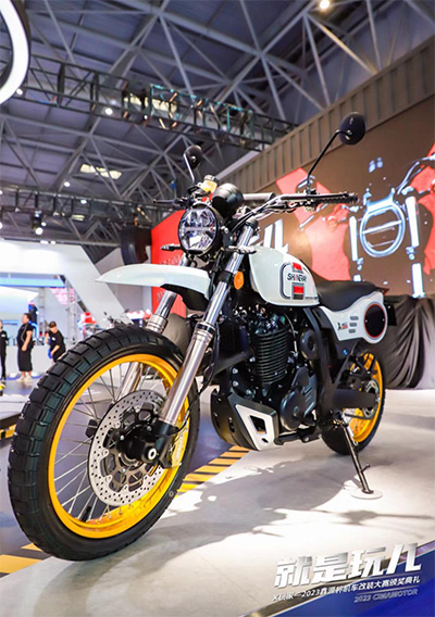 不過在鑫源摩托的展臺上,卻把這個玩過的英雄夢想變成了現實,兼具復古與運動元素的鋒刃525,整車刀劍元素設計相當的濃厚,如果你曾夢想仗劍走天涯,不妨試試這款車,感受鋒刃525帶給你的激情和快感。據官方介紹,整車主打操控性,車架及騎行三角都進行了特別調教,配置上可調KYB減震、西互對置四活塞卡鉗、博世電噴等一個也沒落下,堪稱是一款西裝暴徒。